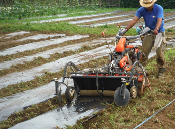 写真右は、マルチを張っている所です。マルチローター(マルチ専用の機械)を使っています。トラクターで耕した後にせっせとマルチをはり、穴を作ってそこに苗を植えます。