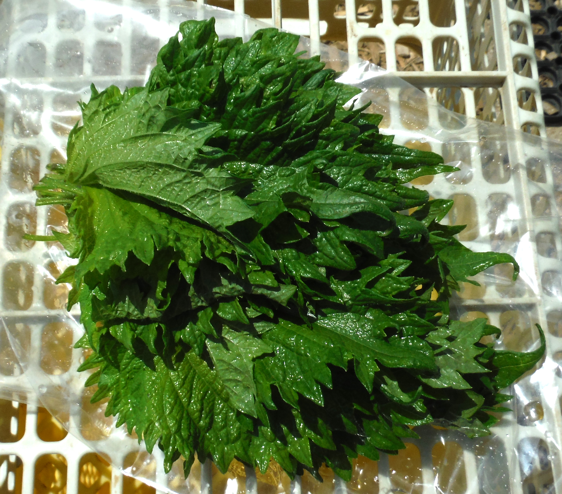 写真左は、とっても美味しい大葉です。大根おろしと食べたり、刺身を巻いて食べたりしても美味しいです。でも、私が一番好きな調理法は、大葉とソーセージのチャーハンです。大葉といえば香りがいいのが特徴ですが、特にえか野菜の大葉は香りが強く、歯ごたえもしっかりしていて、いくらでも食べられます。チャーハンにするとそれがご飯にうつって、いい香りのチャーハンができるのです。写真左は、えか野菜農場直売所で売っていた大葉を買って写したものです。この量で100円は大変お得です。チャーハン3人分は大丈夫です。チャーハンにする時は細かく刻む事をお勧めします。味付けはあっさりめに、塩コショウのみです。まな板で切っている最中も、いい香りが楽しめますよ。