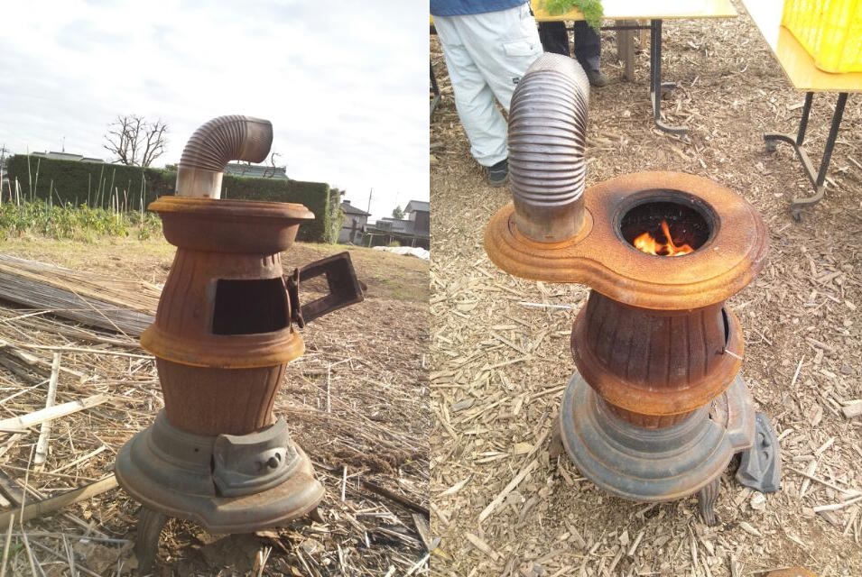 なんと薪ストーブです!こちらはずいぶん前から農場に保管されていた物ですが、ブログにてのご紹介は恐らく初です。これまではドラム缶でたき火をして暖を取っていましたが、今回見つけました薪ストーブはそれよりも小さく、割とコンパクトなサイズなので、現在は直売所などのテラス周辺に設置して、稼働させています☆。