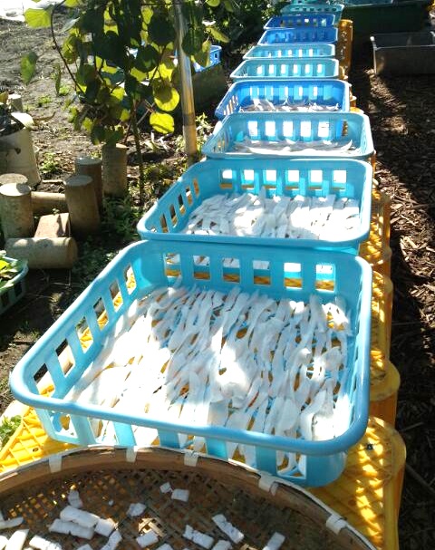 その他に、こんなチャレンジにも取り組みました☆。今月は栽培や野菜販売の他に、1つ商品開発を試みました♪それがこちらの・・切り干し大根です☆!! 過去のブログでもご紹介しました大根が、早い段階で収穫時期を終えたので、これを肥料の糧にするのはもったいないという事への発案から、ピーラー(皮剥き器)で薄くスライスし、そのまま天日干しで開発製造を行いました☆。(`・ω・´)キリッ 11月末現在も乾燥中で、完成までには今しばらく期間が掛かる見込みでございますが、こちらも経過の完成に期待を込め、じっくりと経過を観察し、完成後は改めて本ブログにて、ご紹介させていただきます!